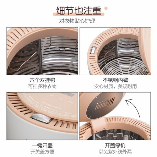 立体热风循环,均匀烘干,不伤衣物面料。不锈钢材质内壁,耐腐蚀不易生锈,可以放心使用。开盖停机,有效避免紫外线外漏。