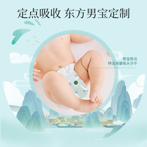 采用维E面层,温和滋润娇嫩肌肤。特设吸收芯,定点吸收均衡导流,防止尿液回渗,屁屁干爽舒适。