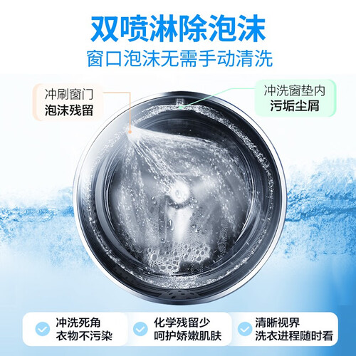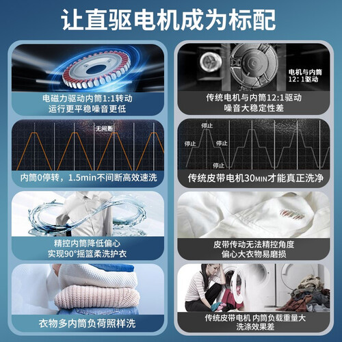 搭载了高性能直驱变频电机,运行时噪音较低,夜间洗衣不会扰眠。机身上带有旋钮,参数标注清晰,操控起来十分简单。