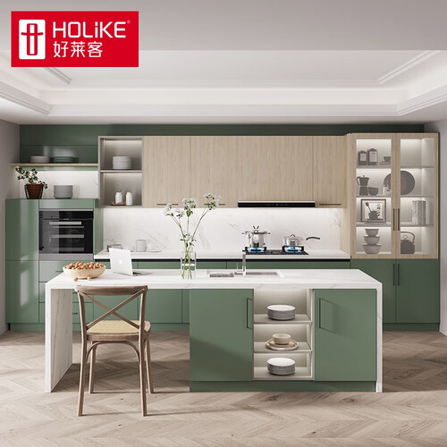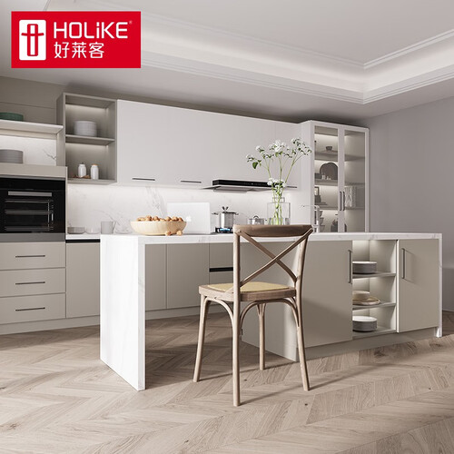 柜身选用细腻木纹色,使得厨房空间更明亮,令人身心都舒畅。嵌入式大体量柜体,节省空间,可以科学有序收纳。