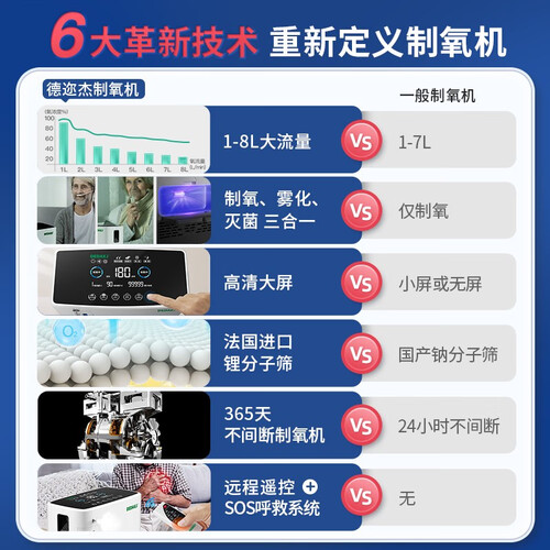 8L大流量制氧机,可24小时持续工作,氧浓度高达93%。采用双降噪专利技术,吸氧更安静。紫外线智能杀毒,吸氧更干净。