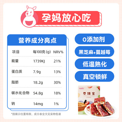 补充孕妈的营养,特别还添加蔓越莓,黑芝麻新疆和田大枣,高山核桃。看的见的果仁,酸甜好滋味,无添加剂安全可靠。