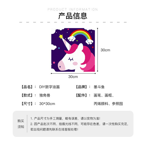 画布上标记有数字,可以对照进行上色,方便你进行油画创作;甄选丙烯颜料上色,防水防尘,不容易掉色,可直接用抹布擦拭清洁。