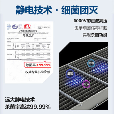 内置静电除尘器,能够轻松过滤比PM2.5更小的粉尘,同时电流非常小,安全可靠,可以循环使用,无需耗材更省钱。
