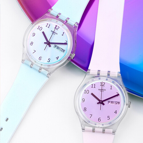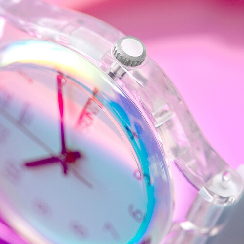 太阳光谱表镜搭载透明表壳,靓丽时尚。表镜内侧点缀数字时标和三针设计,读时更清晰。搭载半透明浅粉色表带,清新自然。