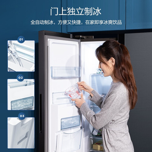 门上制冰机,小巧不占地,自动制冰,方便省事。十层精雕耐指纹面板,触感温润细腻,不易沾染油污,清洁轻松不费力。
