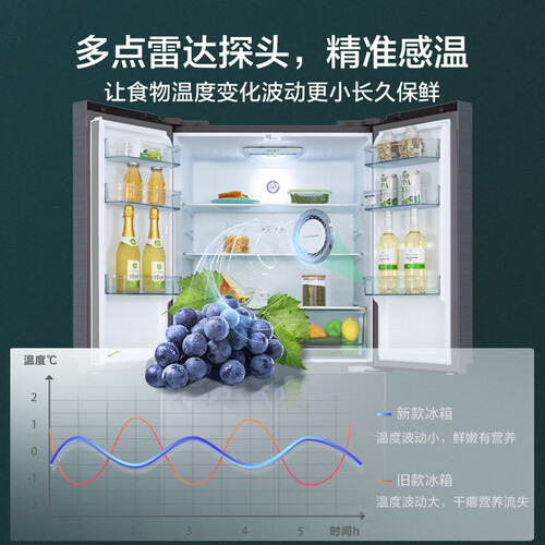 采用水润风冷系统,均匀制冷不直吹,食材新鲜不串味,超宽冷藏隔层,大件食材也能轻松放下。