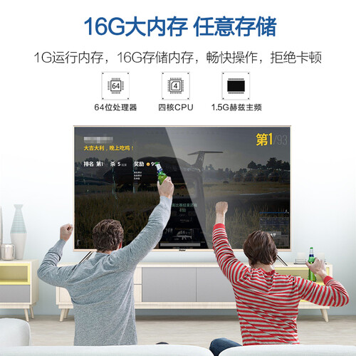 内置4核64位处理器,强劲的性能帮助电视流畅运行。拥有16G的大内存空间,海量的视频、应用随便下载无需忧心存储问题。
