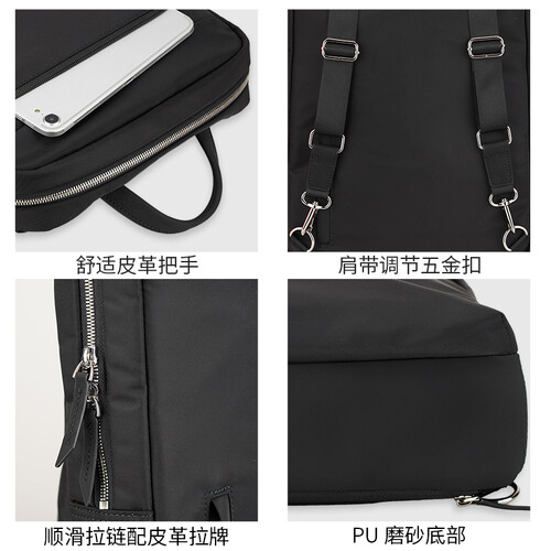 选用高密度斥水尼龙面料和皮革编织制作,安全防泼水,保护包内物品。多功能分区,物品分类细致,有序收纳各种携带物品。