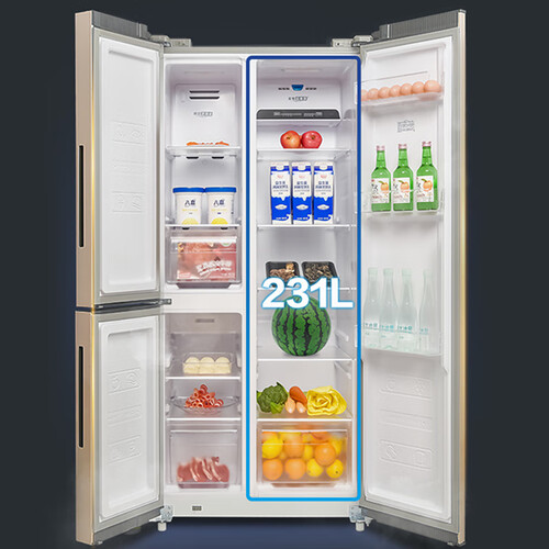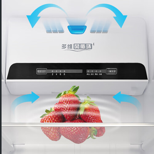 T型三门设计,冰箱内部结构搭配合理,美观且实用。四层多出风口设计,环绕式送风,避免冷气直吹。
