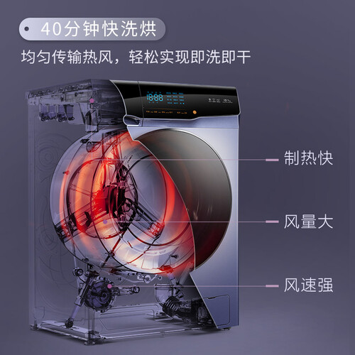 拥有10公斤的大容量,一次能洗全家囤积的衣物,各种床单被罩都能轻松洗涤。有40分钟快速洗烘模式,且衣物无褶皱免熨烫。