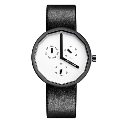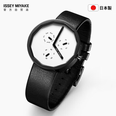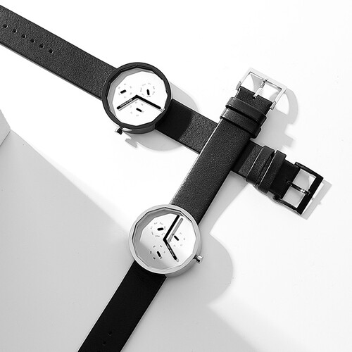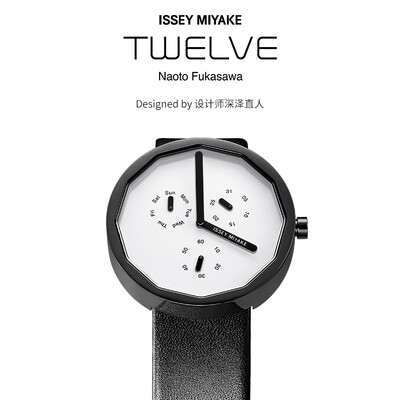 黑色的牛皮材质表带,亲和皮肤柔韧耐磨不刺痒,针扣设计佩戴方便。十二边形的表盘,省去传统刻度,前卫的设计彰显你的品味。