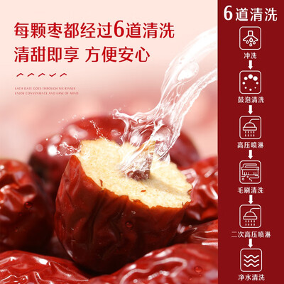 只选用果长2.3-3.3cm的饱满大枣,品尝肉厚核小的好味道,深得家人味蕾。经过6道清洗技术,食用更加安全放心。