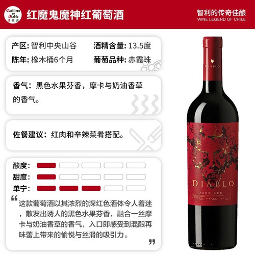 入杯后,浓烈艳丽的红色酒液呈现出优美的姿态,令人着迷。瓶口呼吸孔设计,保证酒体在瓶子内部也能充分发酵,味道更加香浓。
