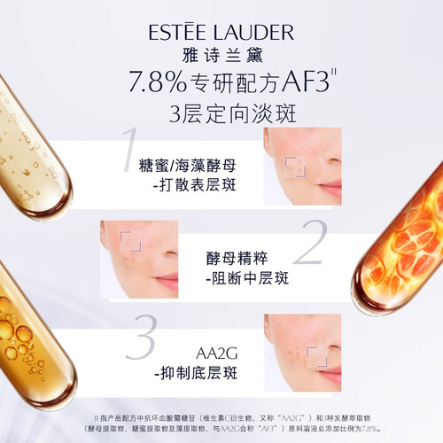 酵母精粹成分,可层层净化色素,淡化斑点提亮肤色,展现自然白皙。AA2G成分,可抑制底层斑,匀净肤色。
