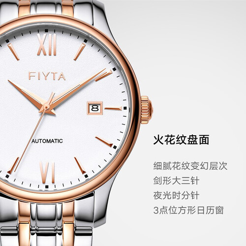 剑形三针覆有夜光涂层,黑暗环境中也可读时,更加人性化。全窗底盖设计,展现机械美学。50米生活防水,更实用。