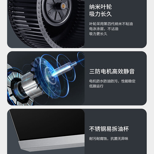 铜线电机,使其动力更加强劲,运行平稳,使用寿命长。宽频火力,可以根据不同食材随心调节,火力更加准确。