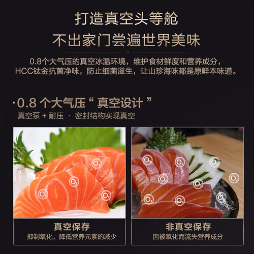 采用一体式灯箱设计,节省储鲜空间,美观不遮挡食材,取放更便捷。搭载真空保鲜技术,防止有害菌滋生,新鲜度高营养不流失。