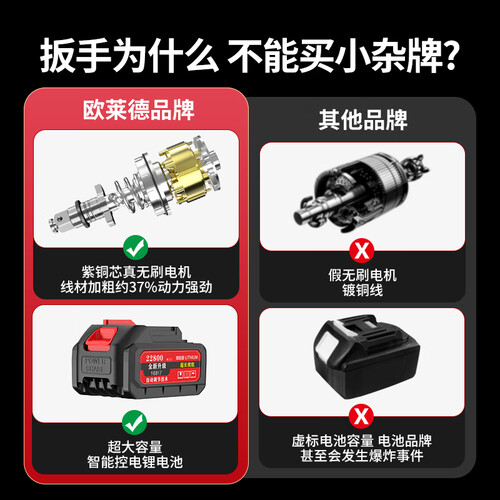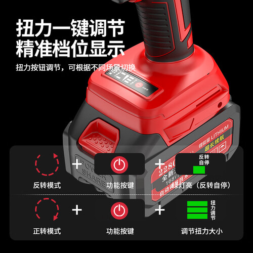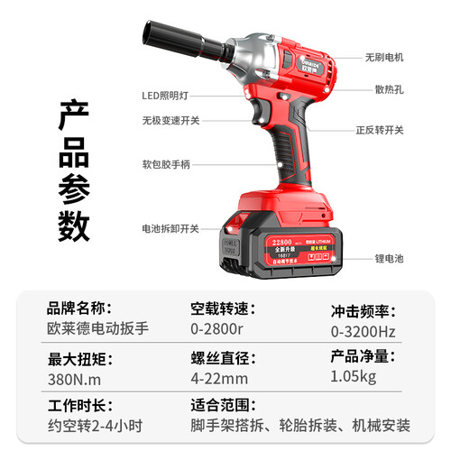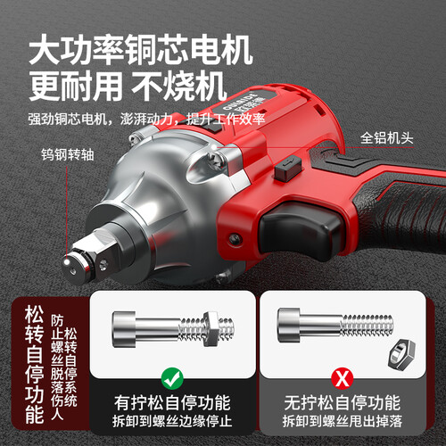 配备全铜无刷强劲电机,动能转换效率高,电力损耗低,配合高性能的锂电池,产生较为强劲的动力,轻松进行安装拆卸工作。