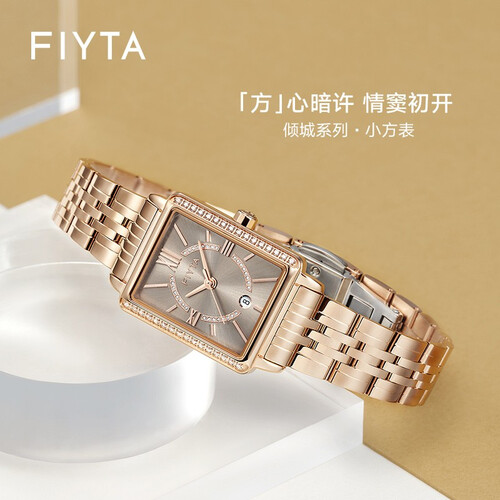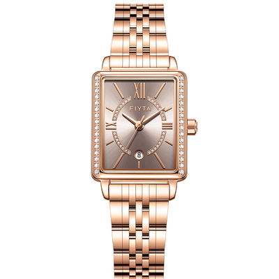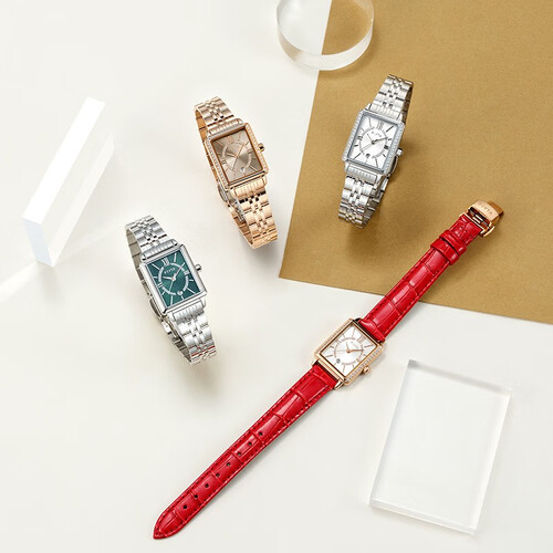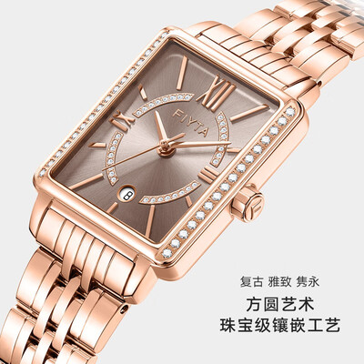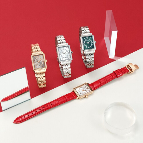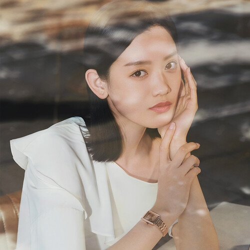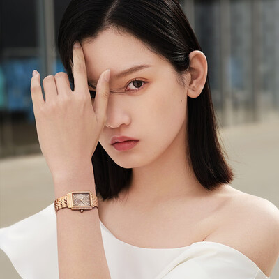 玫瑰金色表身,表盘采用方圆结合,打造时尚复古元素风。双边镶嵌锆钻点缀,彰显优雅个性。立体罗马字钉,读时清晰准确。