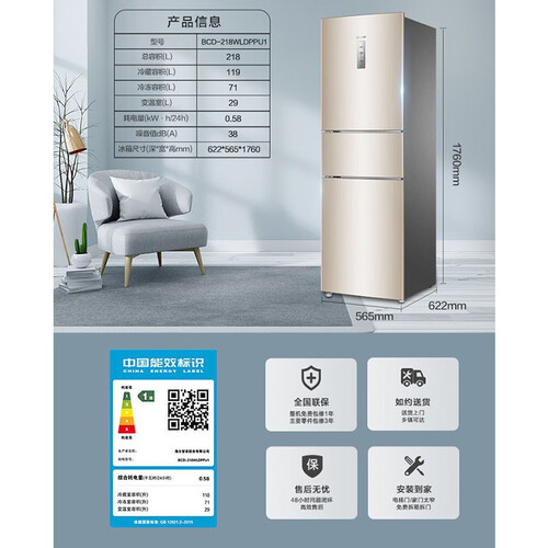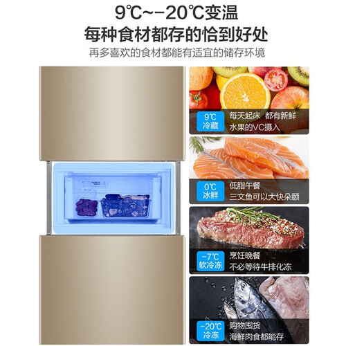 大容量的冰箱,配备冷藏、变温和冷冻室,可根据个人需求放置物品,不管是生鲜或者肉类都能安心放置,随心享用美味更便捷。