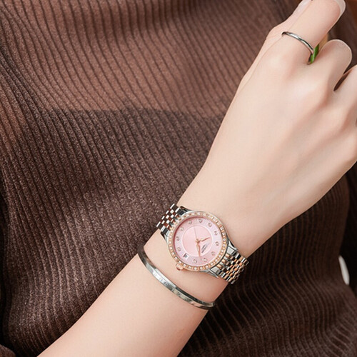 可可爱爱的玫瑰金粉表面,时尚休闲风十足,彰显你满满的少女心。精钢表壳,具有良好的耐磨防刮性,日常活动手部无束缚。