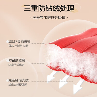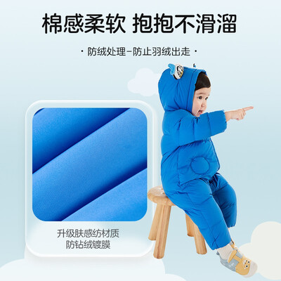 添加90%的安心绒,蓬松柔软上身舒适不厚重,冬季穿搭不累赘,保暖同时宝宝开心玩耍。采用三重防钻绒处理,做工精细,防止羽毛飞走。