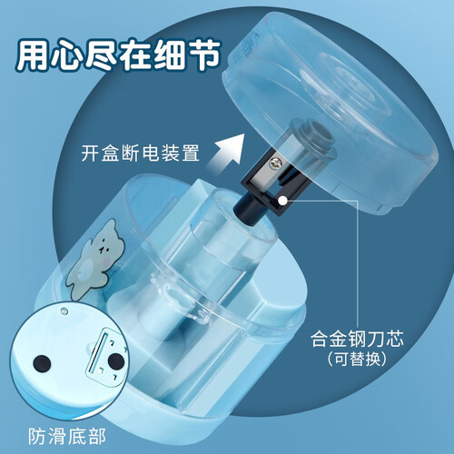 开盒断电装置设计,周全保护儿童,削笔过程杜绝隐患,细节尽显品质。单手向下按压全自动削笔,10S速出新笔,节省大量用时。