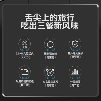使用全铜9腔分火器,不仅更加耐用,而且火苗分布也更加均匀。拥有双边独立定时设计,90分钟自动熄火,安全守护家人。