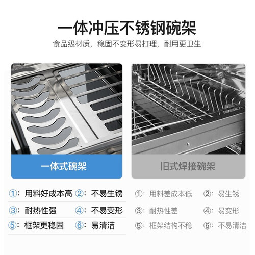 搭载不锈钢碗架,承重力强,可以容纳更多的餐具。支持上下独立控制,采用分层控制,洁净餐具更加节能省电。