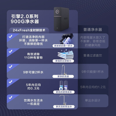 升级多页膜过滤技术,大幅增加了过滤膜的表面积,延长了滤芯使用时间,降低使用成本。具有900G大通量,接水不等待。