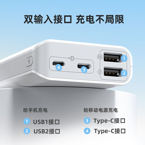 重量上仅202g,加上10000mAh大容量,便携性Max,无惧手机电量不足。双输出充电接口,可以同时为两台设备充电,快速回血。