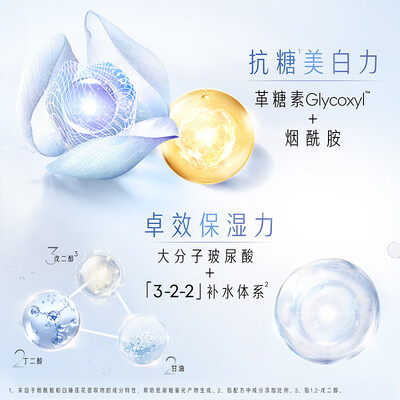 核心抗糖成分,有助于抵抗糖分侵袭,减少蛋白糖化,提升光泽感。含有大分子玻尿酸,能够锁住肌肤水分,保持整天水润。