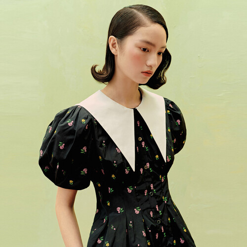 诠释法式浪漫的尖领设计,搭配修饰肩型的泡泡袖,展现优雅复古美感。勾勒腰身的塔克收腰设计,视觉上显瘦,凸显纤细小蛮腰。
