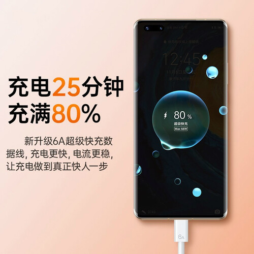 搭配66W快充头,输出6A大电流,30分钟充满85%,超级快充不等待;双面可插,实时监测充电电压电流等,智能适配手机需求。