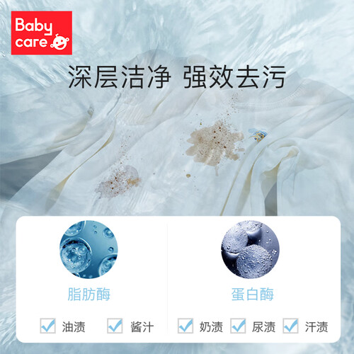 甄选天然植萃提取,无8种有害添加,成分安全,亲肤无害,呵护宝宝娇嫩肌肤。蛋白生物酵素,迅速瓦解衣物顽固污渍,轻松洗净。
