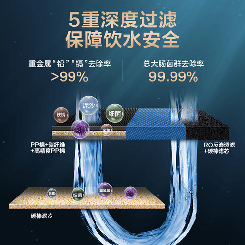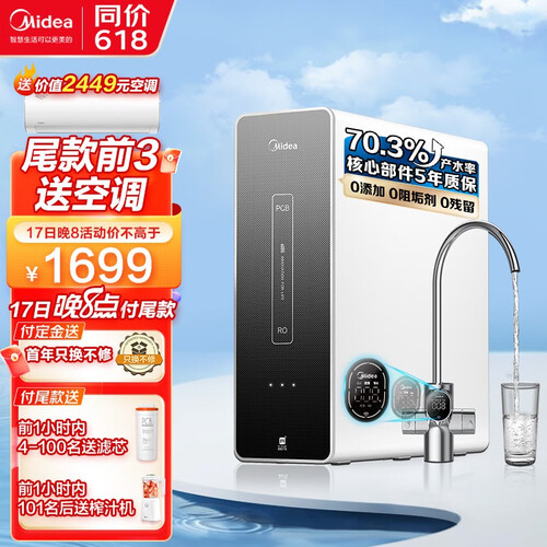 美的这款数显版纯水机,拥有七膜页过滤专利,提高膜片有效利用率,打造3年长效RO膜。达国家一级水效标准,还能实时监控水质。