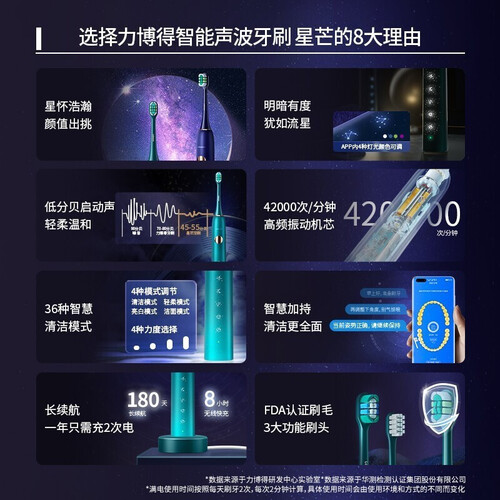 匹配智能APP操控,清晰显示各种信息情况,刷牙可视化更自在。原创星空般闪耀机身设计,还原宇宙神秘浪漫,颜值在线。
