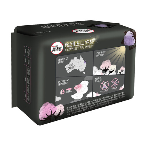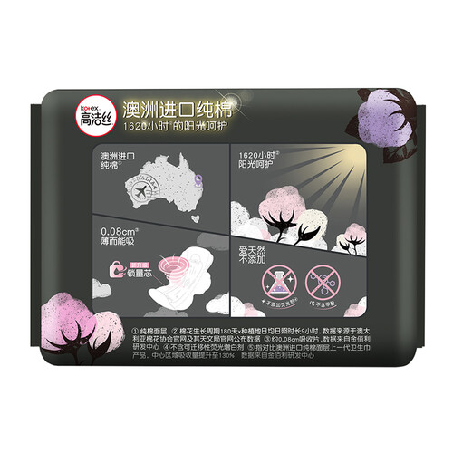 采用澳洲优质进口纯棉,天然无添加,不含有害微生物,敏感肌妹子也可放心使用。新升级锁量芯,大大提升吸收力,让你在经期安心无忧。