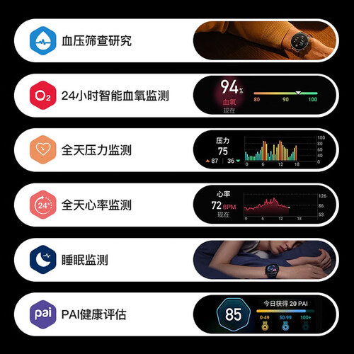 1.45英寸超视网膜高清AMOLED屏幕,生动细节纤毫毕现。支持五星定位,具备50米专业防水性能。健康数据全天监测,精准掌握。