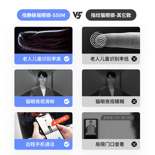 拥有可视猫眼,广角镜头更加清晰,支持视频对讲,安全贴心。全新升级指静脉识别,解锁更高效。再也不用怕老人小孩识别不灵敏等问题。