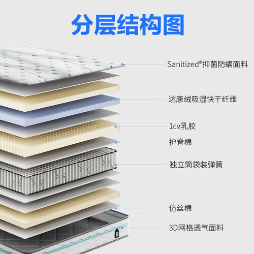 Sanitized抑菌防螨技术,抑菌防螨率高达99%,填充层纤维截面为独特四孔,快速排湿散热,天然高弹乳胶,柔软贴合。