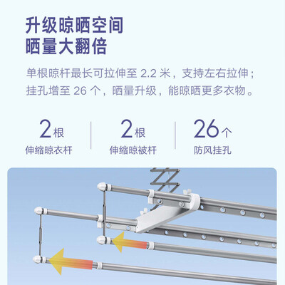具有70斤强力承重,多口之家衣物一次完成晾晒,无需分批。配置渐亮式的LED灯设计,更好呵护眼睛。一键实现升降暂停,操作更简便。