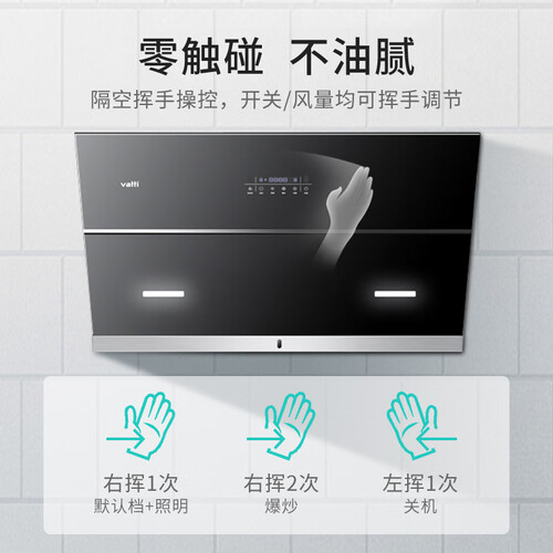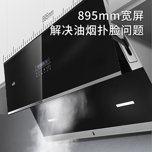 采用隔空挥手操控设计,零触碰,不油腻。895mm宽屏完整笼住双灶,大面积拢烟,防止油烟升腾,有效阻挡烟雾扑脸。