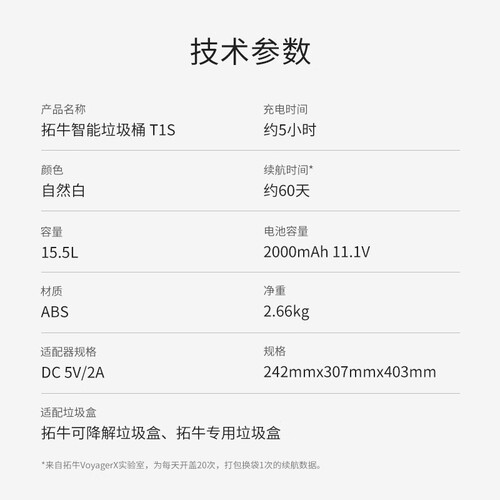 打包,换袋,套装三合一的全能垃圾桶,轻松解放双手。还搭载强悍的锂电池,能达60天持久续航,让你使用更安心。
