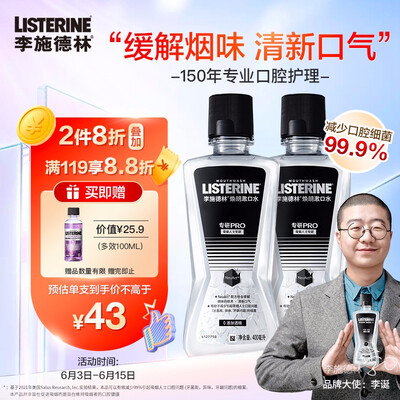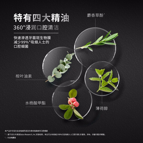 李施德林焕朗漱口水使用了氯化锌配方可以帮助预防牙结石的产生,让牙齿更加自然亮白。能有效减少99.9%细菌,有助于口腔健康。