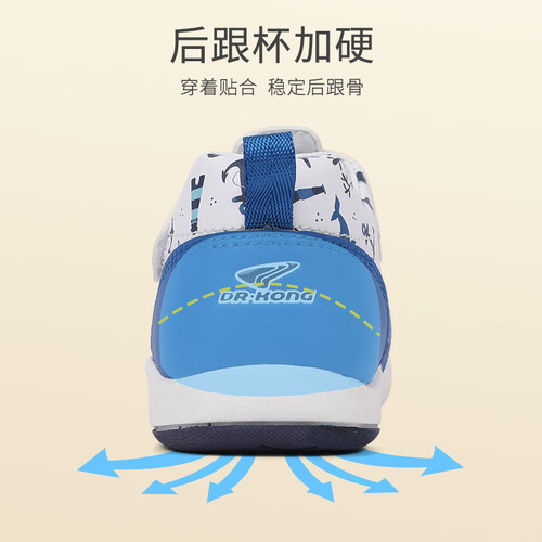 深蓝色的小鲨鱼让造型感更加突出也更吸睛。柔软透气的鞋面容易弯曲,鞋底采用温和足弓垫,帮助宝宝科学走路提升承托力。