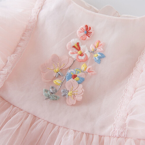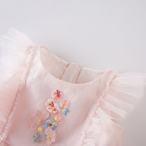 透着古典风的贴布绣布满全身,让裙子更加唯美浪漫,简约的圆领衬托宝宝可爱的脸蛋,小飞袖更是彰显出宝宝天真可爱的一面。