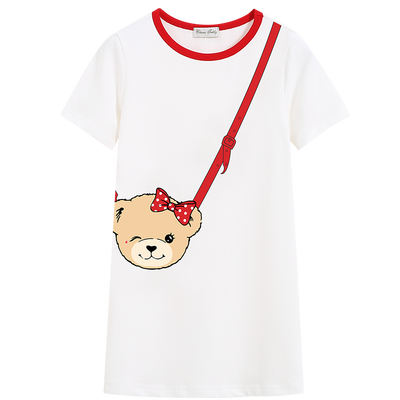 采用40支优质面料制作,触感细腻,舒适亲肤,有很好的透气性。简约圆领设计,不勒脖颈。裙摆流畅,悬垂性好。精致印花,更加萌趣可爱。
