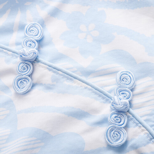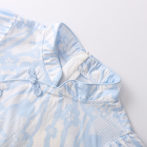 选用100%棉面料制作,触感细腻舒适,穿着亲肤。门襟的复古盘扣设计,看上去更加精致美观。搭配荷叶边泡泡袖,增添甜美气息。